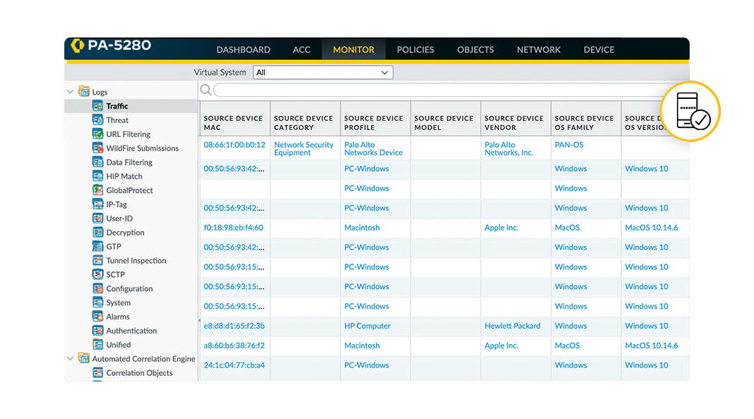PAN-OS의 기능인 Device-ID™는 IP 주소나 위치가 변경되어도 지속적으로 디바이스에 대한 정책 규칙을 제공합니다. 이벤트가 디바이스 및 디바이스 정책과 어떻게 연관되는지에 대한 컨텍스트를 확보합니다. PAN-OS를 통해 보안, 복호화, QoS 및 인증 정책을 개선할 수 있습니다.