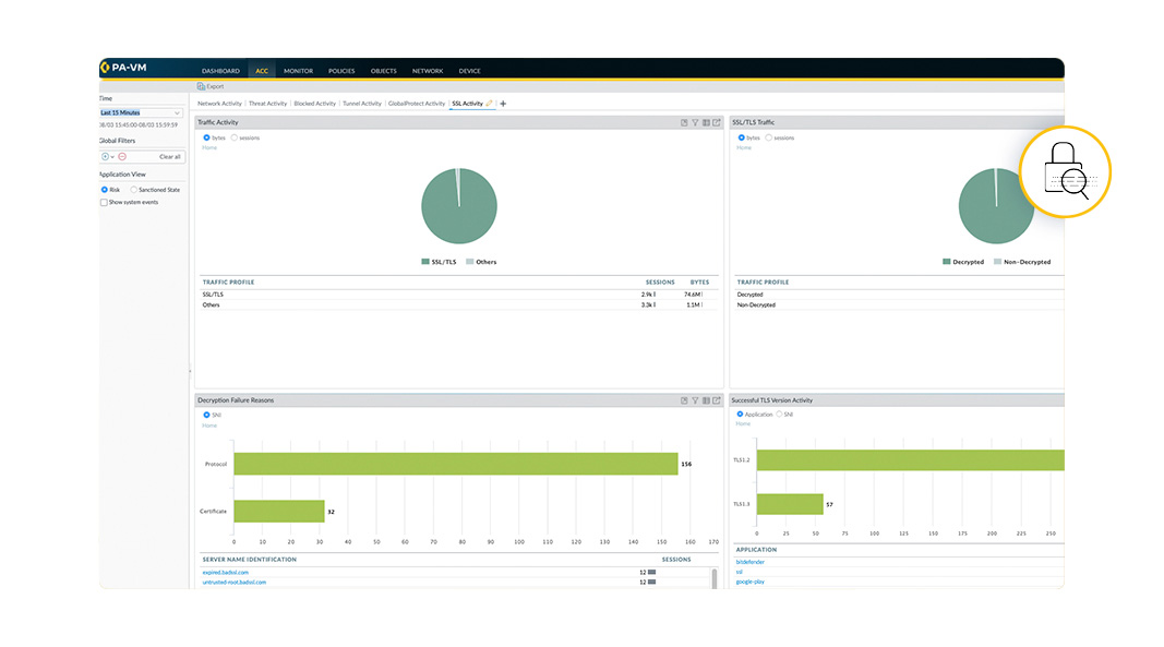스캔을 수행하지 않으면 조직은 암호화된 트래픽으로 인해 내부에 숨겨진 보안 위험을 알아차리지 못합니다. 해커는 이러한 가시성 부족을 악용하여 암호화된 트래픽 내에 멀웨어를 배포합니다. PAN-OS는 TLS 1.3 및 HTTP/2 등의 TLS 및 SSL 암호화 트래픽에 대한 포괄적인 복호화를 제공합니다.