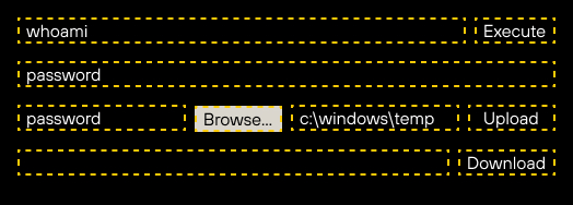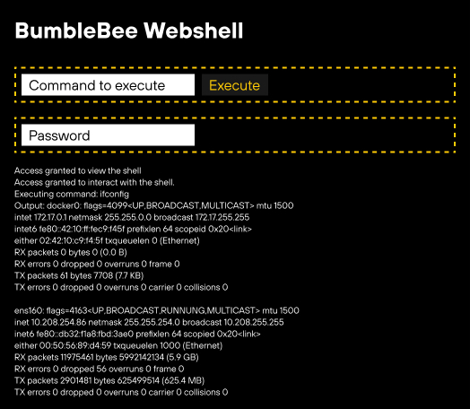 BumbleBee 웹 셸은 비교적 기본적인 멀웨어입니다. 명령을 실행할 수 있으며, 파일을 드롭하고 업로드할 수 있습니다. 이 멀웨어는 공격자와의 상호 작용에 비밀번호를 요구합니다. 또한 노란색과 검은색 줄무늬의 사용자 인터페이스(UI)가 시각적으로 독특한데, 그 명칭도 여기에서 유래한 것입니다.